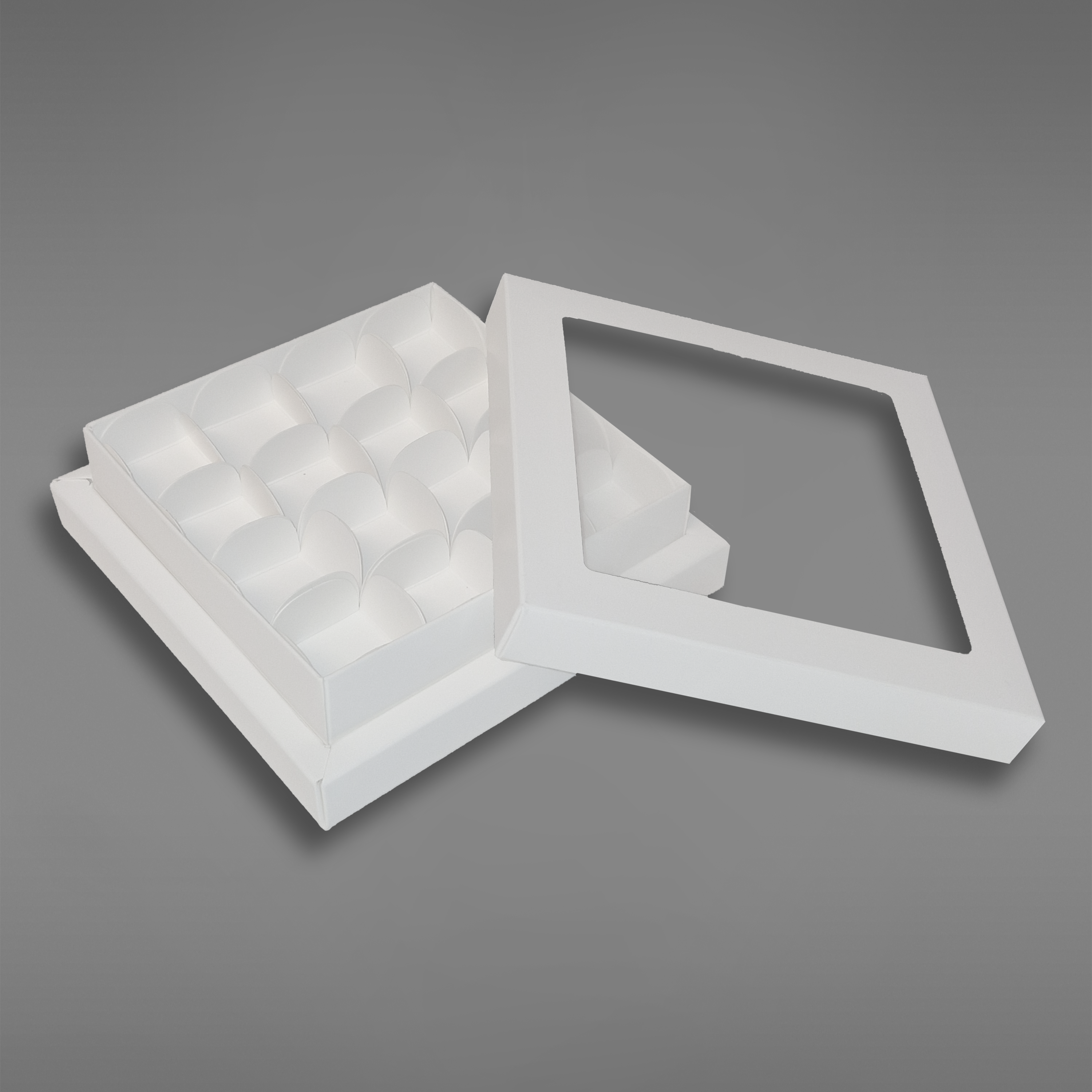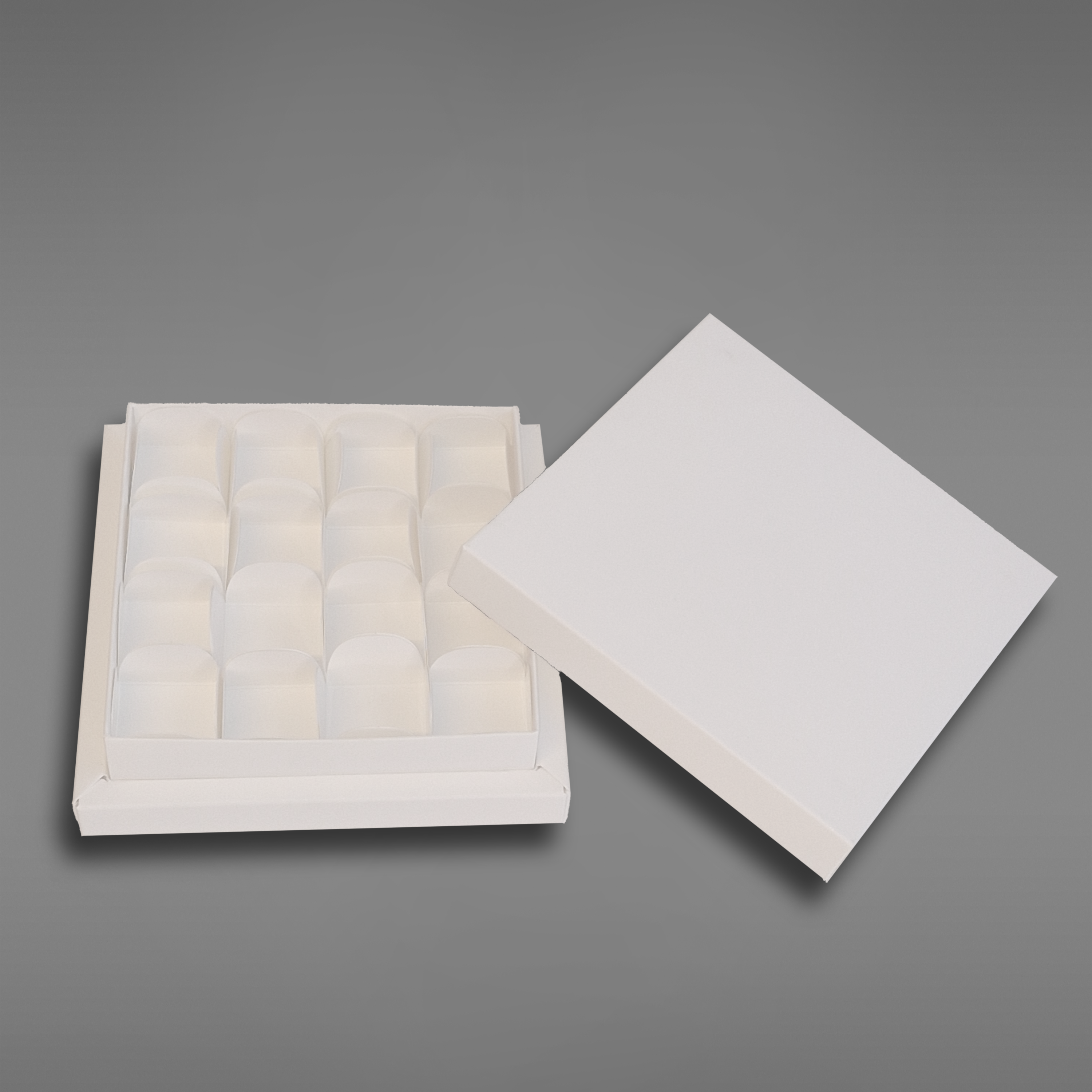Det er plass til 16 biter konfekt i esken ved bruk av innlegg, men esken kan også fint brukes uten innlegg.