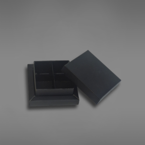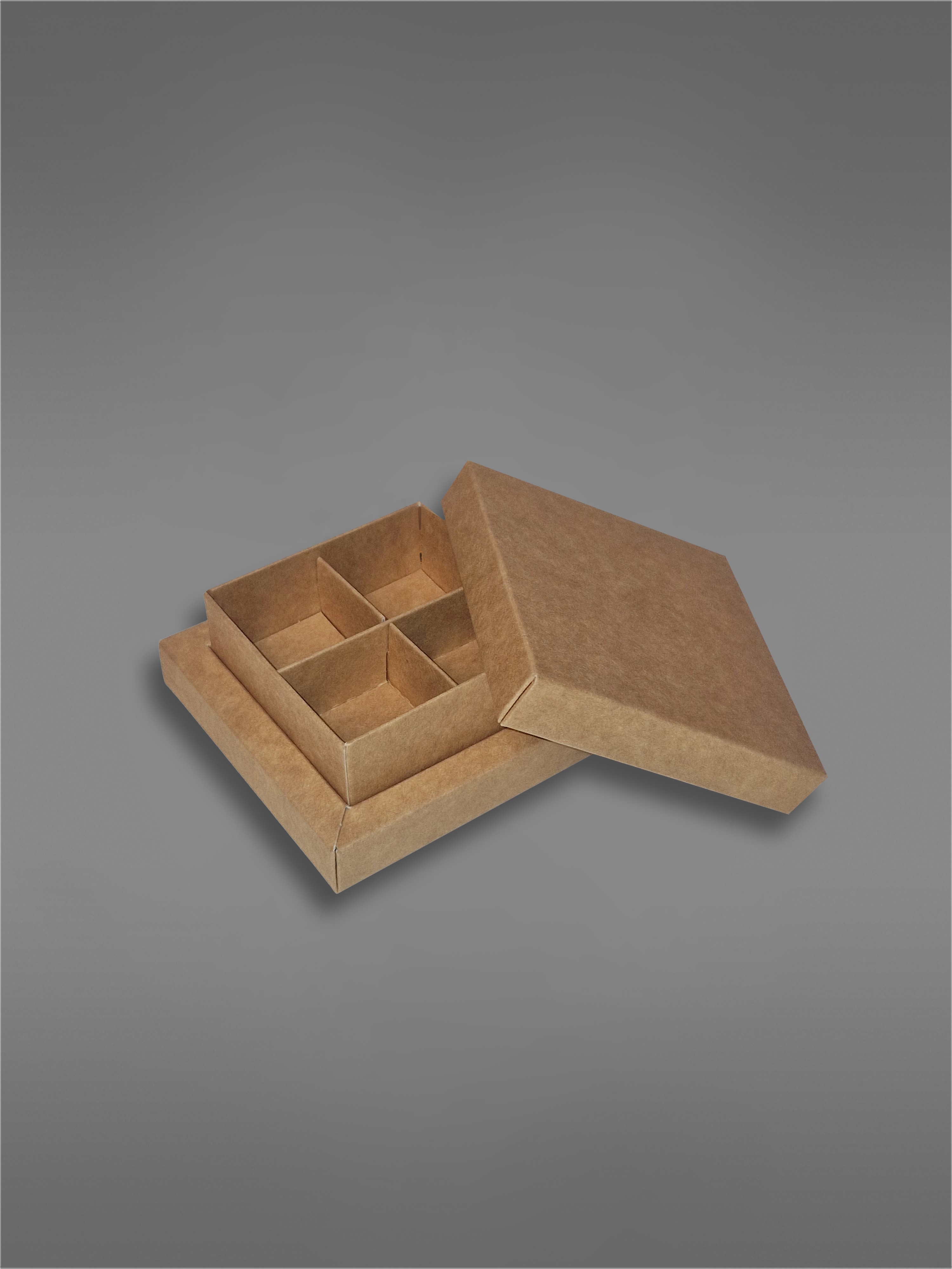 Det er plass til 4 biter konfekt i esken ved bruk av kryssinnlegget, men esken kan også fint brukes uten innlegg.